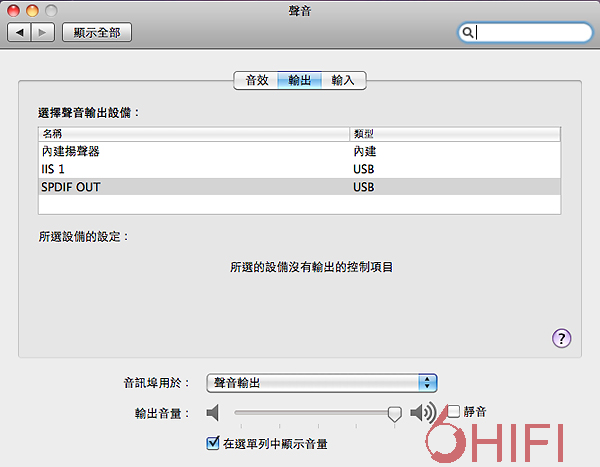 Mac用家很幸福,只要把UC192接上去,马上就会出现在装置列表当中。注意IIS 1与SPDIF Out都是UC192,输出时要选择哪一个端子输出。另外UC192的S/PDIF虽然有同轴与AES/EBU两个端子,但两者并非独立,使用时建议只选其中一组输出,不要两个S/PDIF输出同时使用