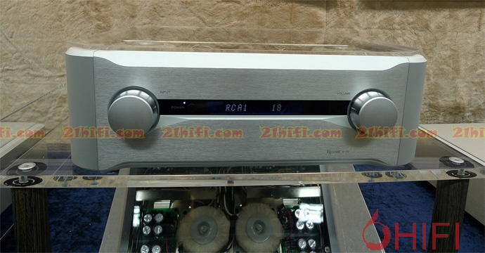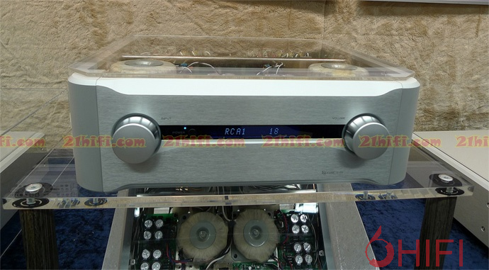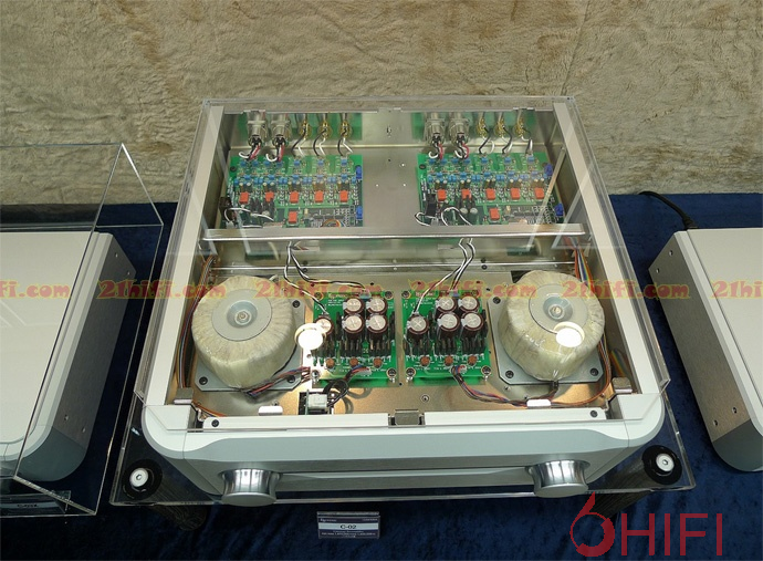机箱采用了特别的上下夹层加固合金框架+设计立体式独立分隔安装,输入/输出左右声道的前置放大及选择电路板分立于机箱后部左右及上层和底层,中间由机箱的框架的巧妙地分隔开,框架前机箱的前部分则为左右声道各自的电源部分。