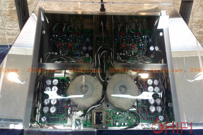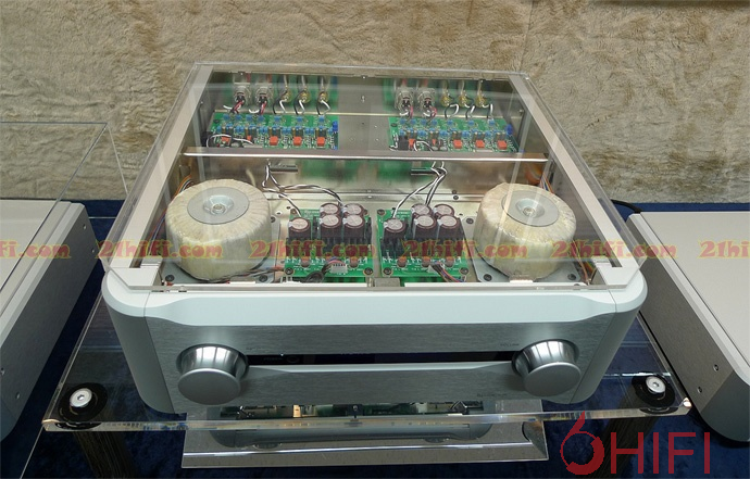这种立体上下夹层中置式框架设计,将比较重的元件安排于机箱的偏中间位置,既能让机器的重心更平衡,实现更好的振动抑制能力,同时变压器的底座与厚重的机箱底板连结在一起,能提供更高的刚性和稳定度,也能巧妙地以物理方式将左右声道、输入输出组件之间完全分隔开,减少互相干扰,在散热处理上也更合理。