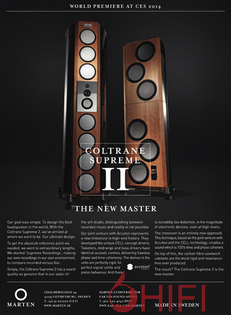 瑞典Marten马田宣布推出全新升级旗舰Coltrane Supreme II(至尊2),独立分体箱体设计,采用全新开发的陶瓷喇叭单元和钻石高音系统,提供顶级音响表现,定位于顶级市场。