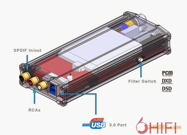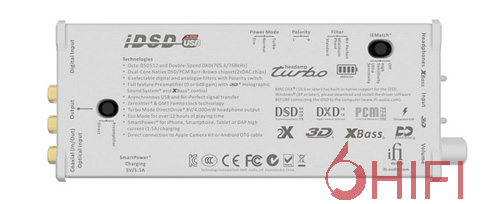 iDSD拥有真正的原生八速DSD512/PCM768/双速DXD的技术,实现无损和非转换的硬解码,支持现在市面所有高清数码音频文件的解码播放。micro iDSD内部时钟采用了飞秒级的晶震,超低抖动GMT电脑控制,RMS时钟抖动12kHz– 1MHz的<280飞秒,模拟输出部分提供3个档位、6种不同滤波模式,用家可以选择不同滤波器以获得不同的音色输出,输入提供USB2.0 A类“OTG”插口,支持iPurifier技术,提供还支持同轴和光纤输入和模拟音频输入、输出除了6.3mm耳机插口,还具有模拟音频RCA输出和同轴数码输出。