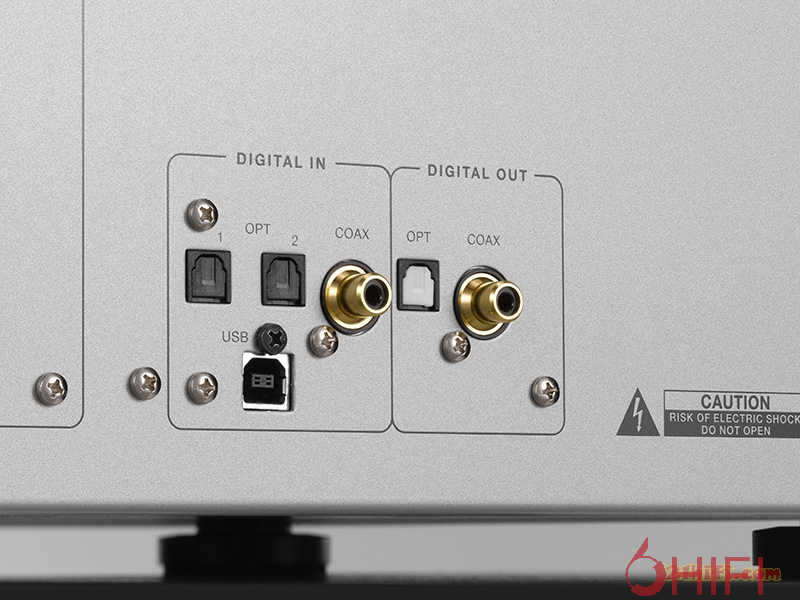 为了在USB输入状态具有更好的性能,在USB输入端配备了一个专用的DSP和高精度低抖动的数字时钟,让USB音频数字数据时基误差更低、精度更高。支持Mac OS X或Windows XP及更高版本的系统,在Windows系统可以使用标准的USB 2.0音频驱动,可以在Windows / Mac系统兼容标准播放软件,当播放DSD文件的时候,也对应支持DOP和ASIO。除了USB输入外,还具有1组数字同轴、2组光纤数字。输出则具有同轴和光纤数字各一、模拟RCA音频输出和XLR平衡模拟输出。