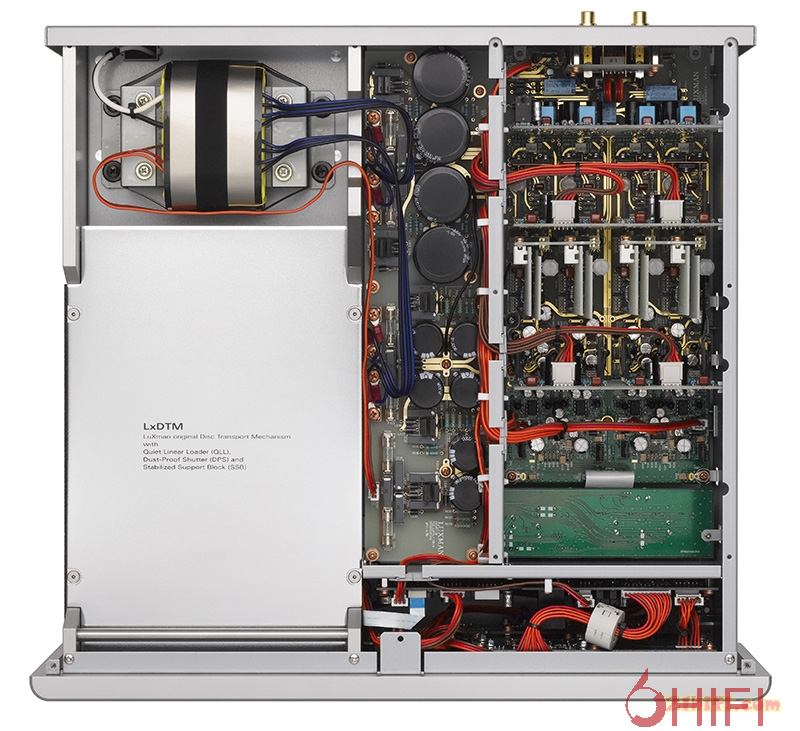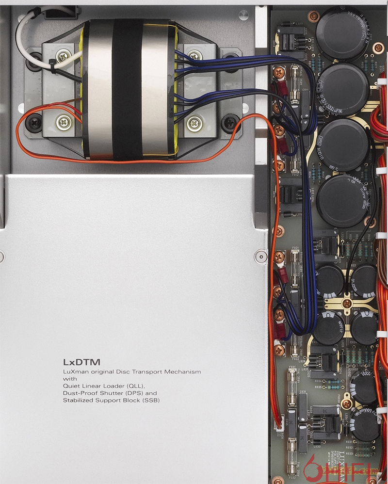 LUXMAN(力仕)耗费钜资开发了自己的激光读取机构LxDTM(LUXMAN original Disc Transport Mechanism的缩写),特别着重于整体的刚性与音乐讯号读出的正确性,采用极为厚重的铝材来制作,彻底排除外部的震动
