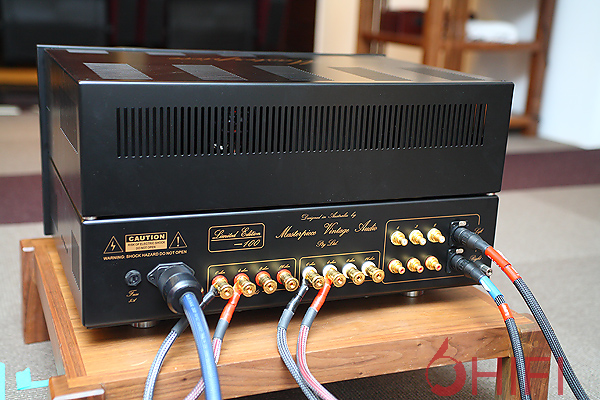 Masterpiece旗舰版KT8C所用的KT8C管则是少有的高档货,是英国GEC生产的早期管,其屏极部分与GEC名管例如U52、KT88使用相同材料,声音与一般KT8C更是不可同日而语。前级讯号管与驱动管分别採用欧洲及美国50至60年代的12AU7与6SN7,身价也不低,市价至少每支3,000元起跳。整流部分,旗舰版KT8C忠于古董经典机的设计,採取真空管整流,亦是使用3,000元以上的美国製5U4G。攸关音色的电容部分,旗舰版KT8C也毫不吝啬地使用多种高品质货色,像是Jensen、MIT、M-Cap等,还有一堆大概只有DIY发烧友才叫得出的发烧电容,都是旗舰版KT8C的基本配备。电路构成则是请高手工匠纯手工搭棚而成,虽然现场我无法拆机观看拍照,但据Masterpiece表示,大师级的搭棚技术已可直逼艺术层次,也是其价格高居不下的主因之一。