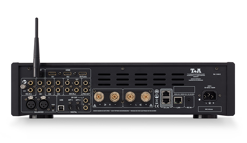 至于PA1000E的类比输入,PA1100E也有。1组高电平XLR平衡输入、5组高电平的RCA类比输入(其中input 1为平衡单端共用,需以开关设定则一使用,另input 5为录音输入,input 4则可选购安装唱放模组),可供连接CD唱盘、收音机等传统讯源。此外,前级输出也让你可以为之加上后级,做双扩大机驱动,遇到难推音箱也不怕。加上丰富的数位输入,PA1100E一台综合扩大机,却能成为音乐和影音的娱乐中心。如果你想要简化音响系统,T+A PA1100E或许可以帮忙。