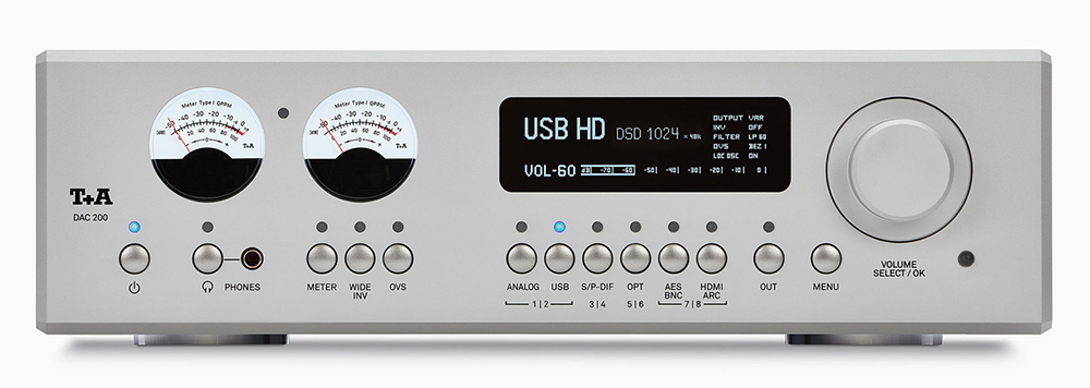 DAC 200 提供完整的数位输入介面,包括 AES/EBU、Coaxial、Toslink、光纤、BNC、HDMI 和 USB,其中 USB 採用 Thesycon 晶片,最可支援 768kHz PCM 和 DSD1024 格式。
