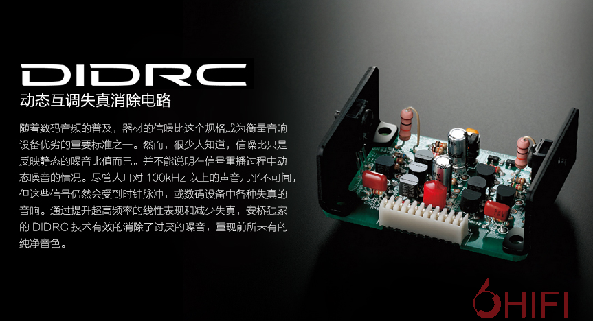 随着数码音频的普及,器材的信噪比这个规格成为衡量音响设备优劣的重要标淮之一。然而,很少人知道,信噪比只是反映静态的噪音比值而已,并不能说明在信号重播过程中动态噪音的情况。为减少重播过程中的动态噪音,安桥在最新的Hi-Fi系统中植入了新开发的DIDRC技术。尽管人耳对100kHz以上的声音几乎不可闻,但这些信号仍然会受到时钟脉冲,或数码设备中各种失真的影响。这种来自超高频的失真会产生一种"差频干扰",从而反噬普通频率范围(20Hz-20kHz)的音质表现。通过提升超高频率的线性表现和减少失真,安桥独家的DIDRC技术有效的消除了讨厌的噪音,重现前所未有的纯净音色。