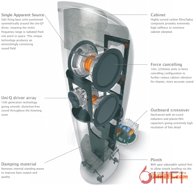 KEF已经巧妙地利用新技术避免这些组件在运动时振动箱体对声音形成的干扰。厚重的后部磁体组件直接互相连接,充分发挥这项技术的优势,以消除低音驱动单元产生的强烈谐振。采用侧烧方式使低音发音音源与第十代 KEF Uni-Q中音和高音驱动单元的中高音发音音源在一致的音场重合共点,这就是取得突破性成就的共点声源技术。这一点从驱动单元本身即可看出,经过精心的布置后,高音单元与中音驱动单元的声学中心位于同一位置。Uni-Q驱动单元的制造材料选用轻便但非常坚硬的精密加固液晶聚合物,以大型 3" (75 mm)音圈在其频率范围内发挥极致性能,并包含一个 1" (25 mm)钛金属球顶高音单元 -背载气管后腔并采用FEA有限元分析技术研发的专利球顶外观,其机械特性能可最大限度地降低工作频带内的谐振程度。这种设计意味着整个频率范围的声音将来自空间中的某一点。在不同驱动单元切换的频段过度根本无法察觉得到,因此最终产生的声场具有非凡的效果。
