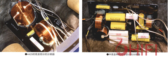 在分频器设计上,4429设计了高频及超高频的增益和衰减调节,这一功能可以根据系统总体特性及听音室声学特性进行平衡度的调整,在试听时,将超高的调谐旋钮设12点钟位置,中高设在2点钟位置可以得到最好的平衡度,当然随着使用时间的增长,单元阻尼会有稍许的改变,可以再行微调以获得最佳状态。