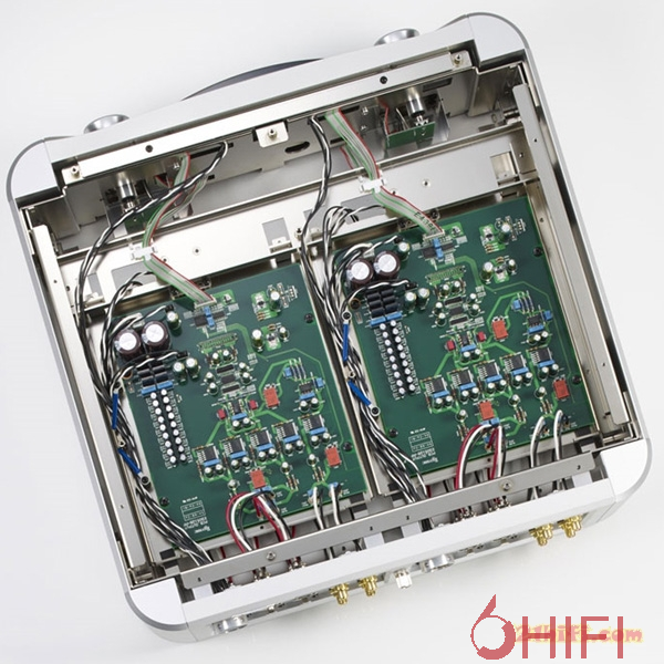 Grandioso C1前级放大器主机机箱采用了特别的上下夹层加固合金框架+设计立体式独立分隔安装,输入/输出左右声道的前置放大及选择电路板分立于机箱后部左右及上层和底层,中间由机箱的框架的巧妙地分隔开,框架前机箱的前部分则为左右声道各自的线路控制部分。电源线、控制线等可能对音频电路有干扰的线路则从机背通过机箱的T型框架的"I"分隔框架内的夹层内走线,以减少电源线路对放大电路的微小影响。能巧妙地以物理方式将左右声道、输入输出组件之间完全分隔开,减少互相干扰,在散热处理上也更合理。