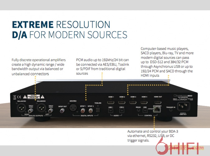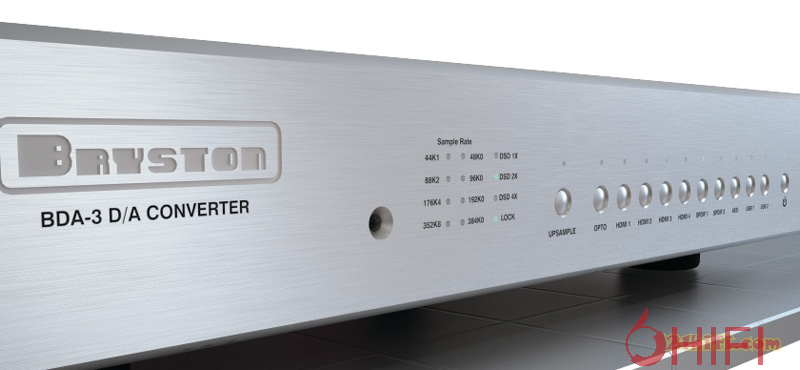 BDA-3的模拟部分采用全平衡纯甲类放大电路设计,基于Bryston数十年的专业模拟电路设计,达至最佳的线路电平放大,具有超高的带宽和动态范围,提供卓越的声音质量,提供有平衡XLR和非平衡RCA立体声输出。数码输入部分除了COAX, OPTICAL, AES-EBU和 BNC外,同样具有USB、HDMI接口组件,由于采用了最先进的异步USB输入,可以支持192/24bit分辨率的高清音频文件的解码播放。支持现在最高格式384kHz/32bit PCM高清音频文件、及拥有真正的原生八速DSD512解码技术,实现无损和非转换的硬解码,支持现在市面所有高清数码音频文件的解码播放。