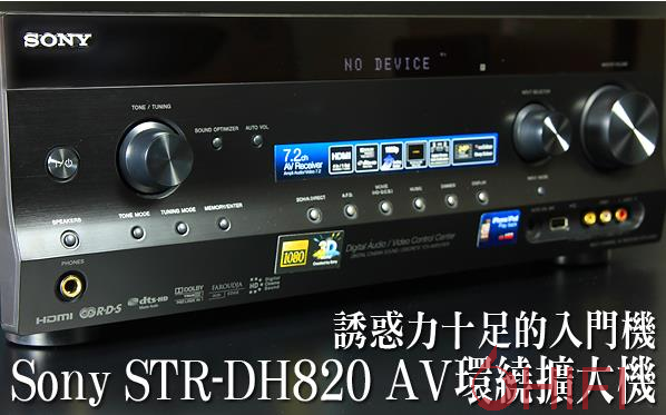 Sony公司今年度推出了两款低价位的入门级AV环绕扩大机:STR-DH520、STR-DH820,配备HDMI 1.4输出/入端子,支援3D影像与多种次世代音效解码格式。本次评测的DH820等级较高,拥有7.1声道输出能力,但原厂资料显示可以外接两颗超低音,所以事实上是7.2声道,另外还支援iPod/iPhone USB直接输入,比另一款DH520更有诱惑力。