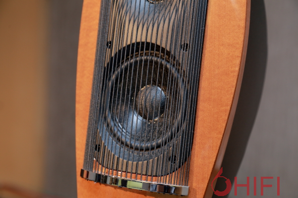 两音路两单体的Lignea,将单体固定在一块金属帐板上,然后再将其固定于木质主支架上。这乃是为了利用不同的材质,以调谐不同的振动频率。Lignea用的单体也与其他两款不同,高音单体是一只27mm的丝质软半球高音,乍看之下与一般的高音单体无异,但细读规格,高频可上达36KHz,真是不可小看。高音单体开口处,有一圆滑平缓的浅号角开口,有助于高音的扩散;这个设计并不见于Ktema与Accordo;所以才说Franco真是厉害,每个喇叭,都是独立的产品,设计概念都不一样。中低音单体实在小巧可爱,直径只有110mm,换成英制,就是四吋低音。这个单体表面有一层coating,这可提供低音振膜相当的阻尼,并改变振膜的谐振。对声音也有影响,助于使声音更圆润厚实一点;实际听来,似乎确有帮助。